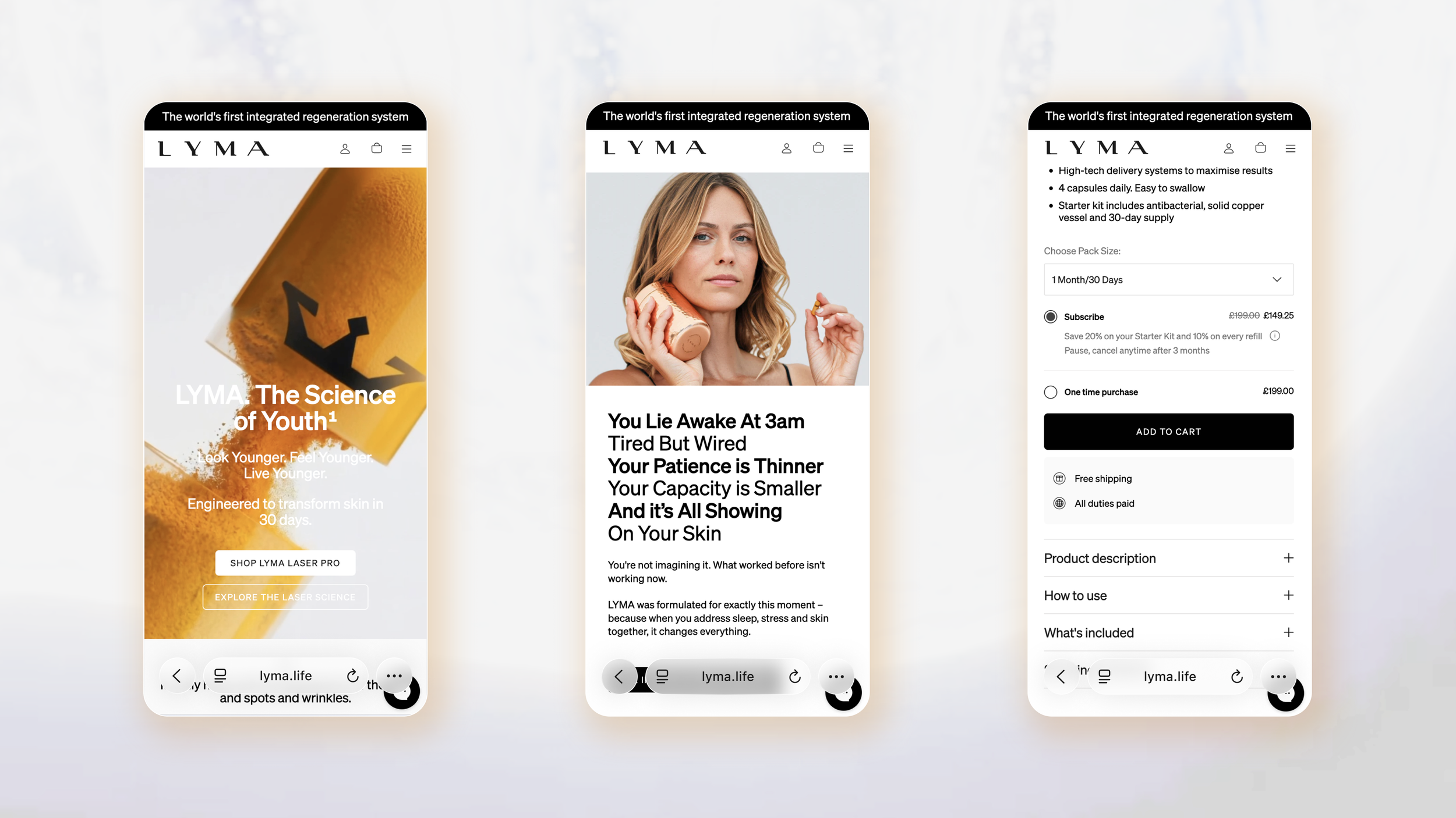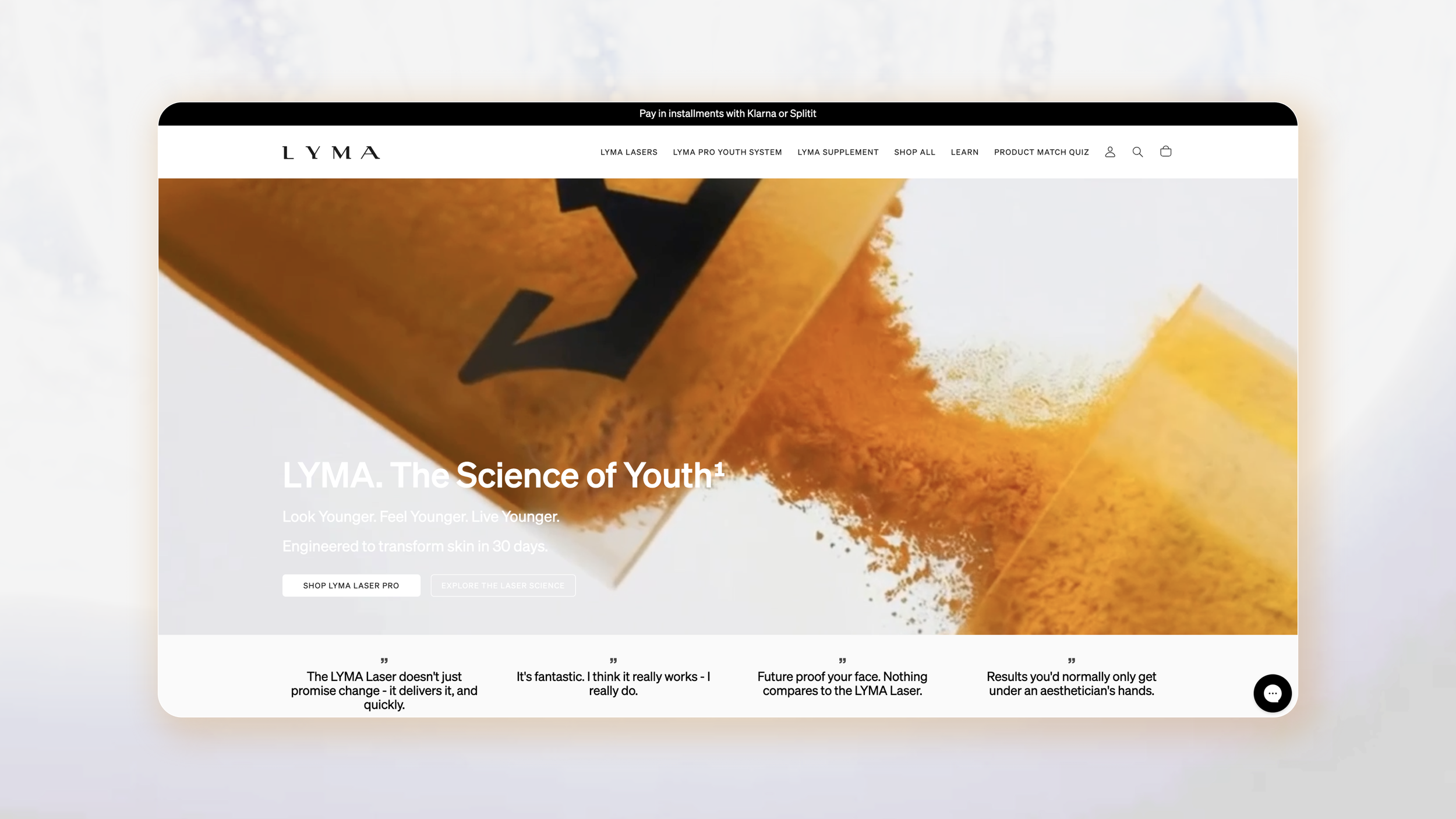 Launch a new responsive website for LYMA, a luxury wellness brand. Ensure a luxury visual experience with scientific backing is clearly conveyed through the design.